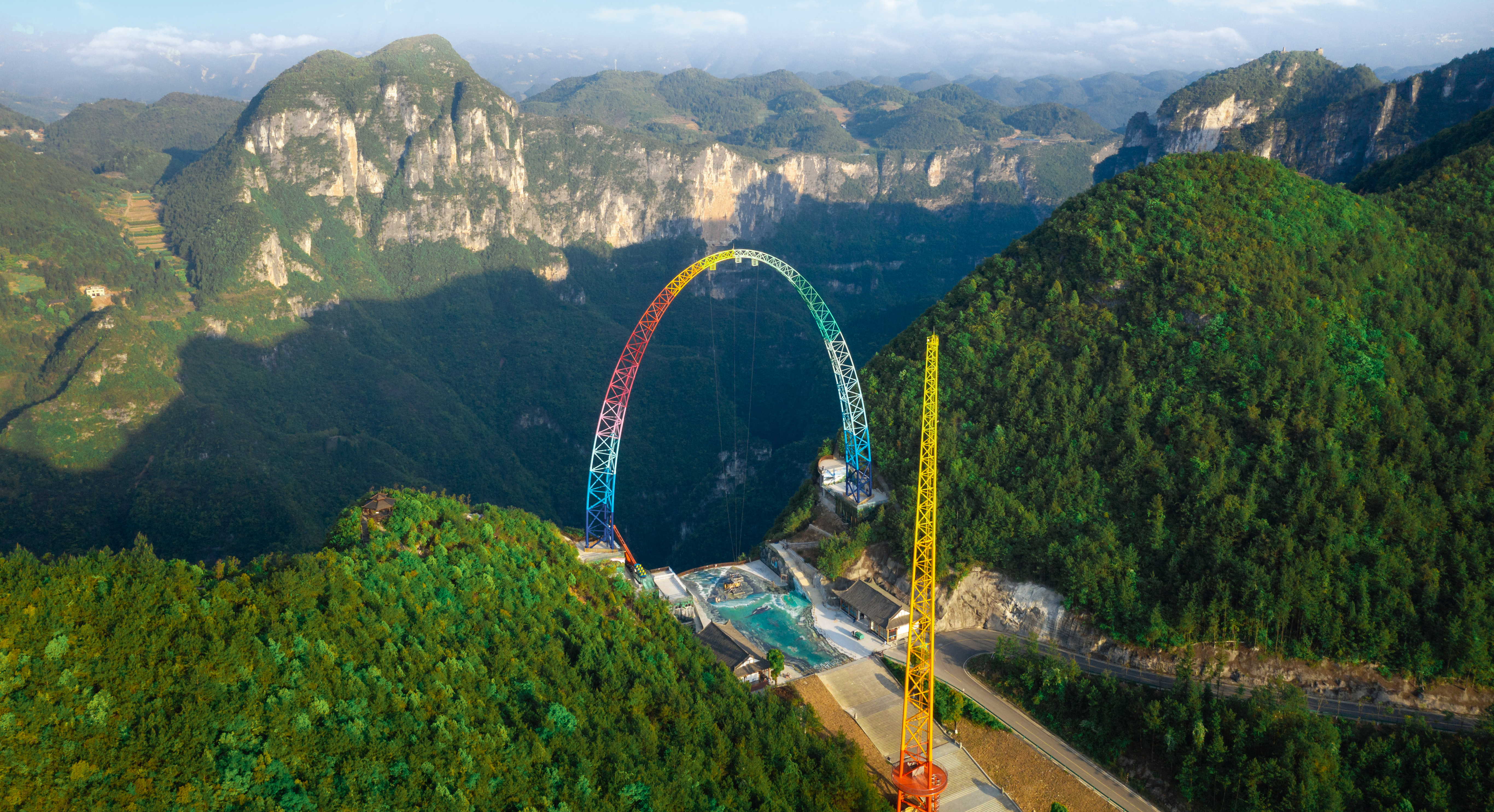 由中冶設(shè)備院自主研發(fā)、設(shè)計(jì)、制造、安裝的云端彩虹秋千,坐落于重慶龍缸5A景區(qū)700米的懸崖邊緣,主體由高100米、基礎(chǔ)跨距87.6米的彩虹涂裝拱形塔和高108米的提升發(fā)射塔等部分組成,該設(shè)備最大提升高度88m,最大運(yùn)行速度可達(dá)130km/h,以“世界最高的框架秋千”稱號被載入吉尼斯世界紀(jì)錄。
